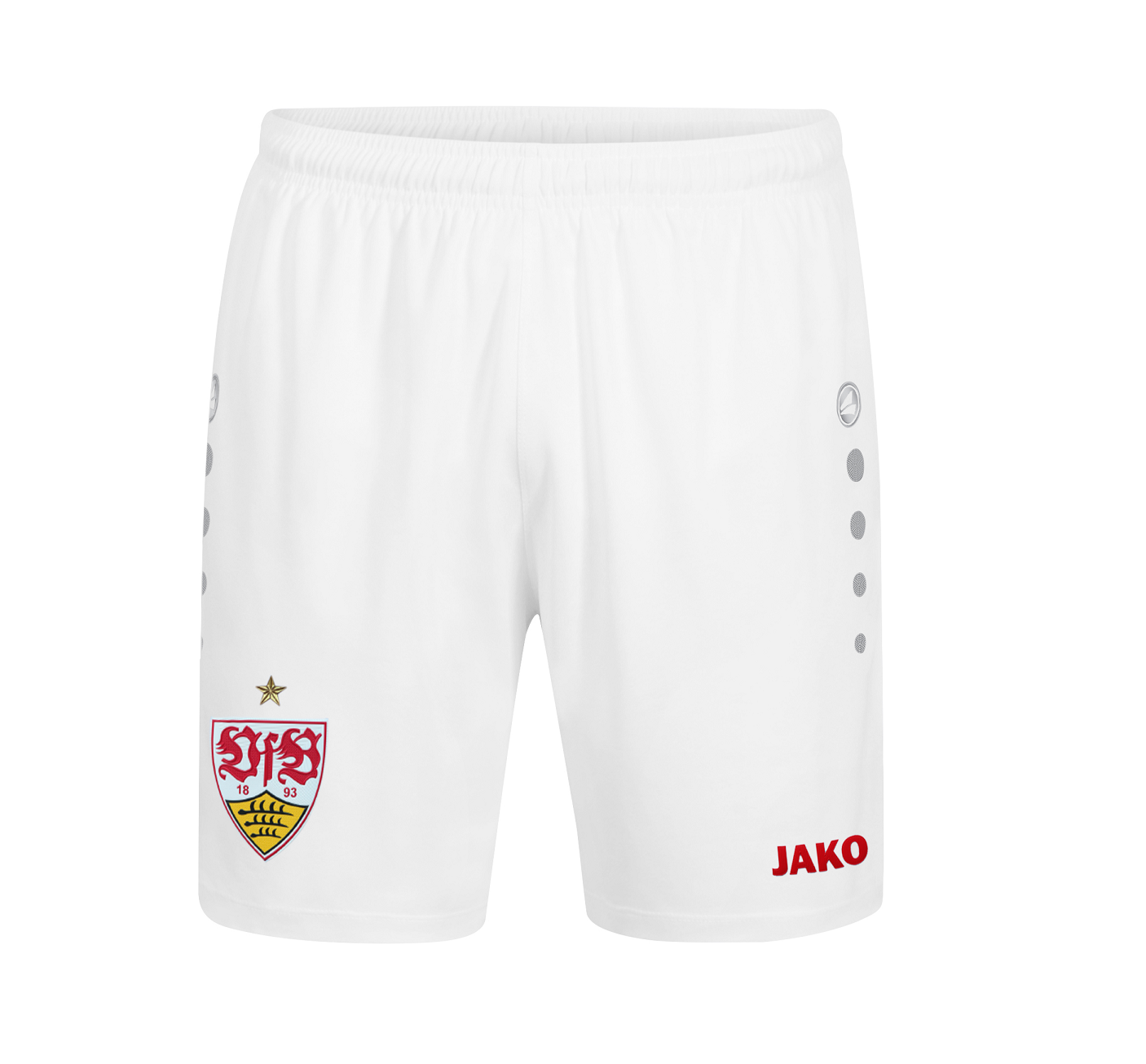 Du bist ein echter VfB Fan? Du verfolgst alle Spiele des VfB? Ganz egal ob heimische Couch oder belebtes Stadion. In deiner Fanausrüstung darf die VfB Short Home nicht fehlen. Passend zum Heimtrikot der Schwaben. Neben den silbernen JAKO Dots auf den Seiten der weißen Short, ist das Logo des Ausrüsters JAKO in roter Schrift auf dem linken Hosenbein aufgebracht. Das wichtigste Designelement der VfB Short Home ist das dreidimensionale VfB Club Logo. Das hochwertige VfB Wappen ist auf dem rechten Hosenbein platziert und trägt den goldenen Meisterstern. Die Designelemente mit Wiedererkennungswert sind erst der Anfang. Die weiße Short passt farblich perfekt zum Heimtrikot der Cannstatter Jungs. Die VfB Spielbekleidung ist hochgradig funktional. Sie unterstütz Mannschaften dabei, ihr volles Potenzial zu entfalten. Für perfekten Halt und optimalen Tragekomfort garantiert der elastische Hosenbund. Die atmungsaktive VfB Short Home besteht zu 100 % aus Polyester. Selbst in anstrengenden Situationen bewahrst Du auf den Rängen der Mercedes-Benz Arena ein optimales Körpergefühl. Komplettiere jetzt dein Fan Outfit mit der VfB Short Home.